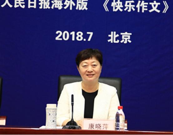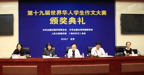 2018年7月21日上午,由中国侨联、全国台联、人民日报海外版和《快乐作文》杂志联合主办的第十九届世界华人学生作文大赛颁奖典礼在北京举行,中国侨联副主席康晓萍出席并致辞。来自中国、德国、美国、荷兰、日本、比利时、加拿大等国家的百余名获奖师生代表欢聚一堂,共赏美文佳作,感受华文魅力。
