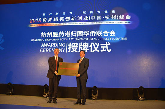 会上,举行了授牌仪式,宣布杭州医药港侨联、新侨创新创业基地(杭州)联盟成立,“杭州医药港”被授予“浙江省新侨创新创业基地”。