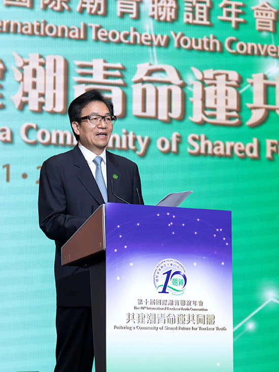 他谈到,“中国梦是国家梦、民族梦,也是每个中华儿女的梦”,改革开放以来广大华侨华人始终与祖(籍)国和人民同呼吸、共命运、心连心,是中国改革开放和现代化建设的重要参与者、贡献者和受益者,是祖(籍)国建设和发展不可或缺的重要力量。他说,遍布全球的海外潮人是华侨华人的重要组成部分,新时代为广大侨胞参与改革开放伟大事业、参与祖(籍)国和家乡建设提供了历史性的新契机、新舞台,广大潮籍青年应该凭借敏锐的直觉和迅速的行动,努力成为所在国和地区蓬勃成长的中坚力量,成为中国与世界交往的重要使者,成为实现中华民族伟大复兴和构建人类命运共同体中的一支生力军。
