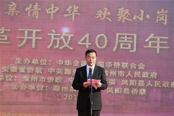 据悉,“亲情中华·欢聚小岗村”庆祝改革开放40周年文艺晚会由中国侨联、安徽省侨联、滁州市委、滁州市政府主办,滁州市侨联、凤阳县委、凤阳县政府承办,滁州市演艺集团、凤阳县侨联协办。安徽省人民政府副省长周喜安,中国侨联副主席齐全胜,中国侨联文化交流部部长刘奇、副部长邢砚庄,中国侨联信息传播部副部长谢惠蓉,省政府副秘书长赵振华等观看了演出。安徽省侨联党组成员、副主席兼秘书长杨冰,滁州市委副书记、市长许继伟为演出致辞。海外华文媒体采访团和1000余观众观看了演出。通过全球网络直播,更有近27万海内外华人华侨观看演出直播。继安徽场演出后,本次“亲情中华”庆祝改革开放40周年主题活动还将在北京进行展演。