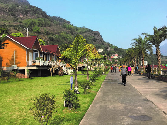 那是一排排显有滇北、川南传统民居风格的三层别墅小楼,建筑群呈扇状排列,错落有致;户外庭院绽放着各色鲜花,馨香淡淡,若有似无;更有邻水之家,遥对壮阔的江面,万顷碧涛,晨昏晴雨,自可听鸟儿啁啾,渔舟唱晚.....整座小镇布局,由中心快速通道和沿江快速通道形成交通主干,其间分布街区,配套建有学校、车站、商店、卫生院,以及戏台、牌坊、长廊等景观。从社区中心广场到江边景区有3条通道,沿江大道临水一侧是800米长的带状生态公园。时值丽月,园内紫藤 、蔷薇、三角梅竞放;道路两旁的椰树、董棕树、粗如碗口的楠竹也都争相逐绿。
