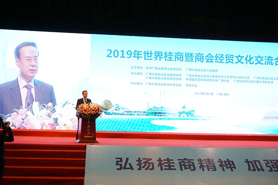 7日上午,由广西壮族自治区党委、政府主办的2019年世界桂商暨商会经贸文化交流合作大会在南宁举行。全国政协副主席、民建中央常务副主席辜胜阻出席大会并讲话,自治区党委书记鹿心社、中国侨联党组书记、主席万立骏、全国工商联副主席陈放致辞,自治区党委副书记、主席陈武介绍广西经济社会发展情况,自治区政协主席蓝天立等出席。