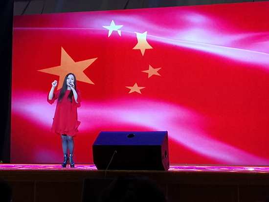 演出最后,郭蓉以《红旗飘飘》和《歌唱祖国》两首歌曲将现场推向高潮。全场观众自发起立,挥动手中的五星红旗引吭高歌,热爱祖(籍)国、热爱家乡的情感喷薄而出,许多人泪流满面。