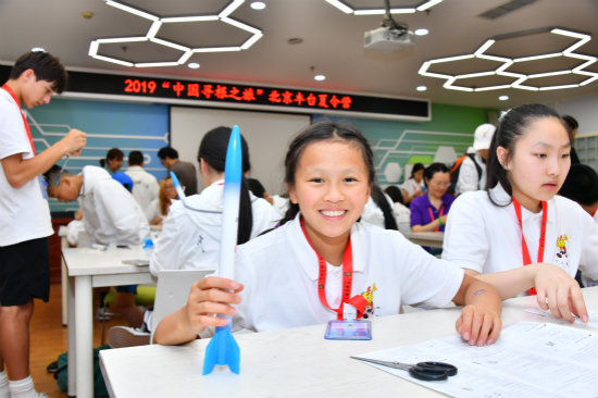 在东高地青少年科技馆里,营员们参观了我国近年来发射的各型火箭模型,通过讲解员讲解,营员们了解到我国卫星发展历程,感受到中国高科技发展步伐。随后,营员们争先恐后参与体验航天员训练项目。在航天发射模拟教室里,营员们充当火箭发射工作人员,分别坐在16个操作岗位上,按照真实火箭发射流程,依次完成各岗位工作,最后顺利将火箭发射升空。让营员们真实感受到火箭发射的过程。最后,营员们自己动手制作小火箭,制作完成后,由营员们亲手按动发射按钮,在小火箭点火发射升空的时候,营员们高声欢呼,雀跃不已。在返程的车上,来自瑞典的徐揭同学仍然意犹未尽,畅想到:“中国是一个航天大国,这是最让我爸爸妈妈引以为自豪的事情,如果有一天能把‘寻根之旅’夏令营办到空间站或者月球上去就好了。”