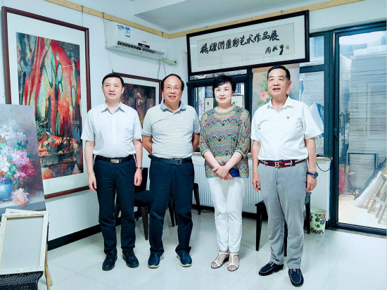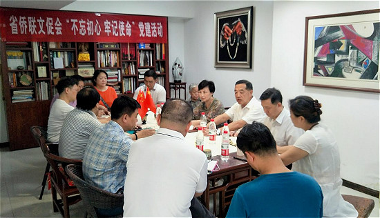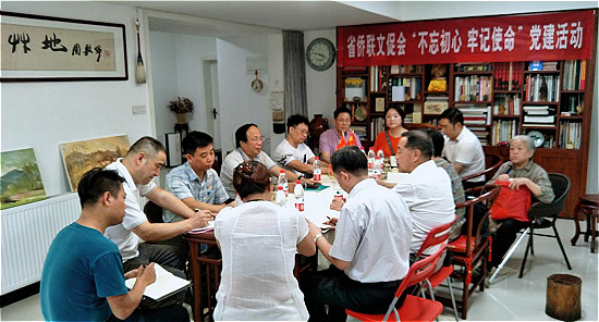 调研组一行参观走访了省侨界文促会理事、武汉市民革书画研究院副院长、国家一级美术师杨耀洲先生的工作室,并在此组织召开座谈和党建活动。大家围绕“不忘初心 牢记使命”主题教育活动开展讨论,在侨联如何创新工作方式增强政治引领作用议题上,大家表示要坚持党的领导,矢志不移听党话跟党走,努力发挥侨界文学艺术人才荟萃的优势,拼搏创新,努力奋进,为湖北经济社会和文艺事业发展、为宣传中华文化和湖北楚文化、实现中华民族伟大复兴作出贡献。大家纷纷表示,要通过侨联这个平台,把侨界文艺人才凝聚起来、团结起来,通过开展主题鲜明、丰富多彩、侨界群众喜闻乐见的文艺活动,增强侨界群众的凝聚力、向心力。在座谈中,大家还就在侨联组织的引领和指导下,组织开展庆祝新中国成立70周年文艺演出、开展“侨界文化大讲堂”活动、设立书法美术摄影舞蹈等各专业分会、组织开展文艺讲座和分享、加强文促会和校友会的联系交流、开展侨界文艺界手牵手相亲活动等方面提出了很好的意见和建议。