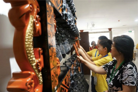 走进民乐馆,映入眼帘的是一把古琴,营员们被其吸引,围在四周拍照。老师给大家介绍了传统乐器“缶”:2008年北京奥运会上,“击缶迎宾”作为北京奥运会开幕式序曲,就是取法于古人。营员们对于这些古老的乐器感到非常好奇,纷纷上前体验,兴致高昂地在敲编钟、弹古琴和敲鼓。