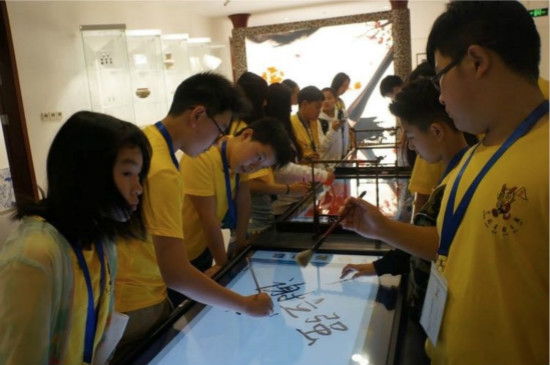 离开民乐馆,大家又来到了汉字馆。营员们围坐在一起,认真地观看关于汉字的讲解视频。营员们在体验汉字活字印章的同时,并亲自拿着毛笔体验书写毛笔字。科技的力量,让大家在电子屏幕上不用水墨,也能够写出一手漂亮的字呢!