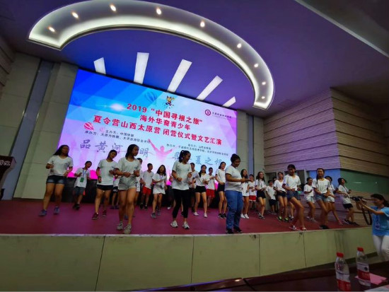 7月14日下午,2019年“寻根之旅”夏令营—山西太原营闭营仪式暨汇报演出隆重举行,来自加拿大、澳大利亚、西班牙、意大利、美国、德国等国家的120名华裔青少年圆满完成了十天的“寻根之旅”。太原市侨联和太原旅游职业学院为优秀营员颁发了荣誉证书,表彰了优秀营员,并观看了由领队和营员自编自导自演的精彩节目。