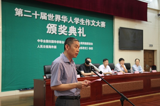 7月27日上午,由中国侨联、全国台联、人民日报海外版、《快乐作文》杂志联合主办的第二十届世界华人学生作文大赛颁奖典礼在北京隆重举行,中国侨联副主席齐全胜出席仪式并讲话。