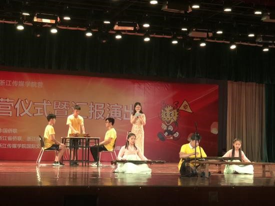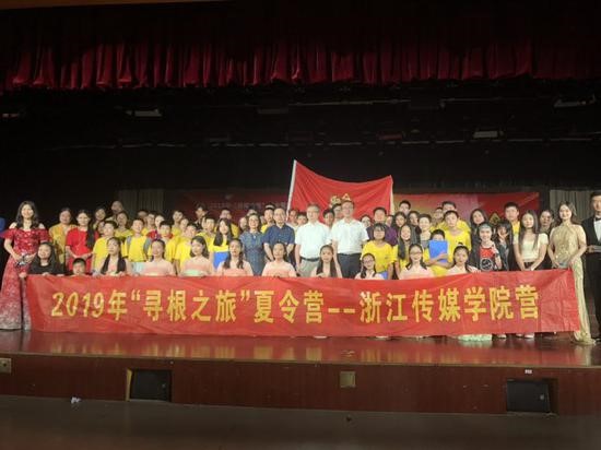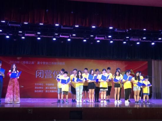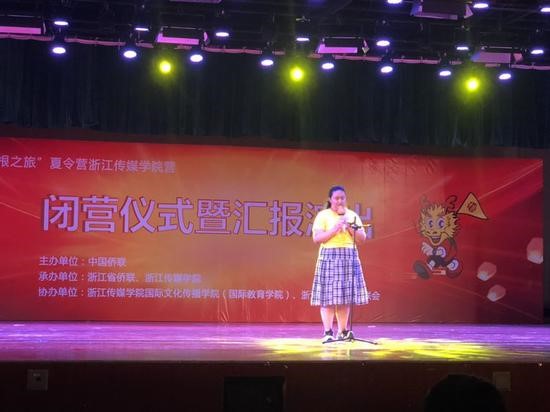 “少年强,则国强。少年智,则国智。”配合着雄壮的背景音乐,华裔青少年们在台上排成三排,整齐地朗诵着《少年中国说》。7月18日,2019年“寻根之旅”夏令营—浙江传媒学院营举办闭营仪式暨汇报演出,标志着为期十天的夏令营落下帷幕。