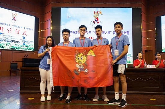 图为:香港地区青少年“寻根之旅” 夏令营钦州营营员代表展示营旗。