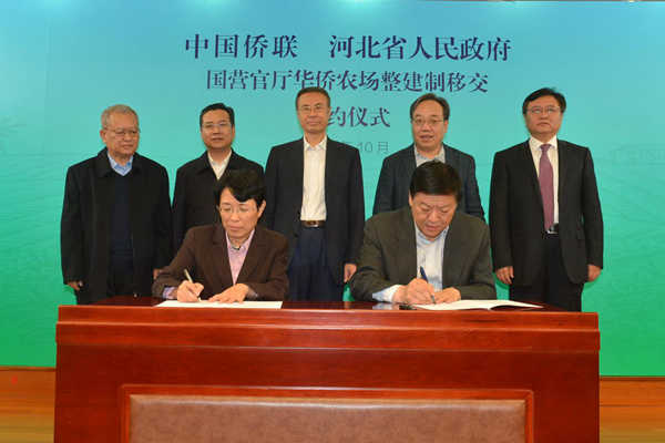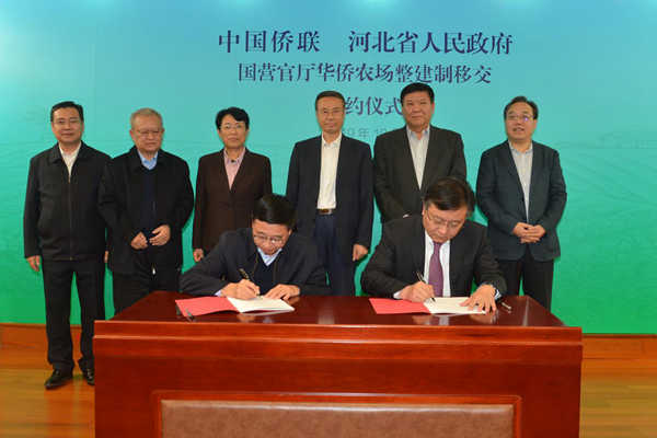 10月25日,国营官厅华侨农场整建制移交签约仪式在京举行。中国侨联党组书记、主席万立骏出席并见证签约仪式。党组成员、副主席隋军,河北省委常委、常务副省长袁桐利在仪式上致辞并签署了《中华全国归国华侨联合会 河北省人民政府关于国营官厅华侨农场整建制移交工作框架协议》。