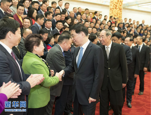 上午9时30分,王沪宁来到人民大会堂金色大厅,同代表们亲切握手,并合影留念。