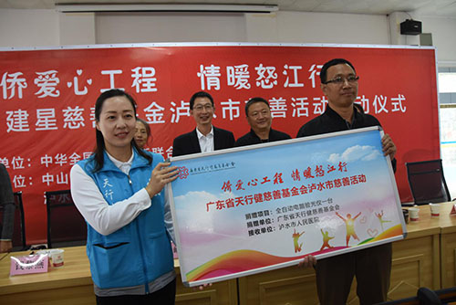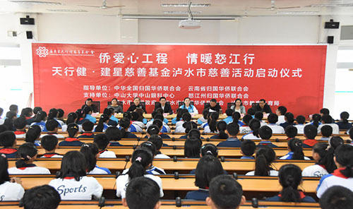 广东省天行健慈善基金会为全面落实“侨连五洲·七彩云南”第17届东盟华商会暨第1届“一带一路”侨社论坛活动会与泸水市签订的连续4年“实施精准扶贫、助力乡村振兴合作”项目“一对一”结对帮扶协议,11月12日“侨爱心工程、情暖怒江行”2019年广东省天行健慈善基金会泸水行启动仪式在泸水市六库镇中学正式启动。