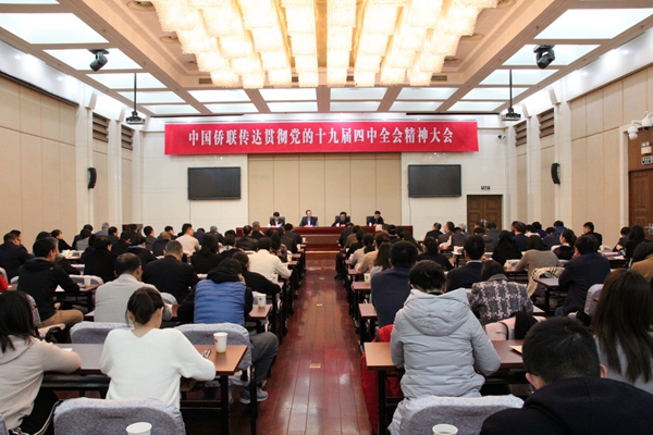 11月14日上午,中国侨联召开全体干部大会传达学习党的十九届四中全会精神。中国侨联党组书记、主席万立骏主持会议,传达了党的十九届四中全会盛况和《中共中央关于坚持和完善中国特色社会主义制度 推进国家治理体系和治理能力现代化若干重大问题的决定》(以下简称《决定》)精神。中国侨联党组成员、副主席隋军传达学习《关于〈中共中央关于坚持和完善中国特色社会主义制度 推进国家治理体系和治理能力现代化若干重大问题的决定〉的说明》,副主席李卓彬、齐全胜出席会议。