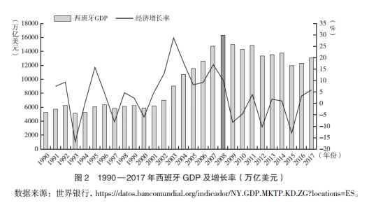 2008 年的金融危机对西班牙影响巨大,整个国家经济进入负增长阶段,几年之间,西班牙迅速跌出全球十大经济体行列(见图2)。