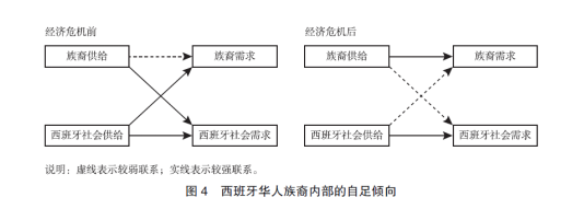 本文分析和探讨了2008 年经济危机以来西班牙中国移民企业的新发展策略和发展形势,剧变的经济和社会环境为中国移民企业带来挑战的同时也带来新的发展机遇。华人企业家具有较强的应变和发展能力,能够发现新的机会并结合自身优势资源和实际情况对企业进行调整,在经营理念、组织架构、人员雇佣方面,西班牙中国企业家展现出了与时俱进的特点,他们突破传统族裔经济的发展并在经营模式上创新,最大限度地实现资源的优化配置和利用,不拘一格地将新兴事物融入经营管理之中。而从供需整体来看,经济危机后,西班牙社会总需求相对疲软,而华人族裔群体内部需求更为有活力,企业的纵向创新和横向突破发展都出现以供给内部需求为主的倾向(见图4)。