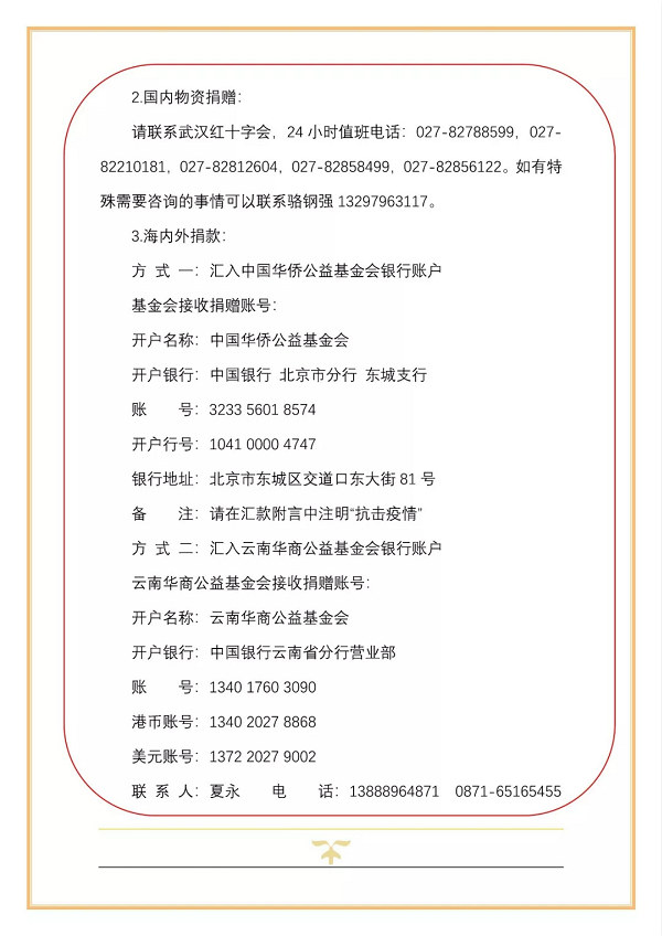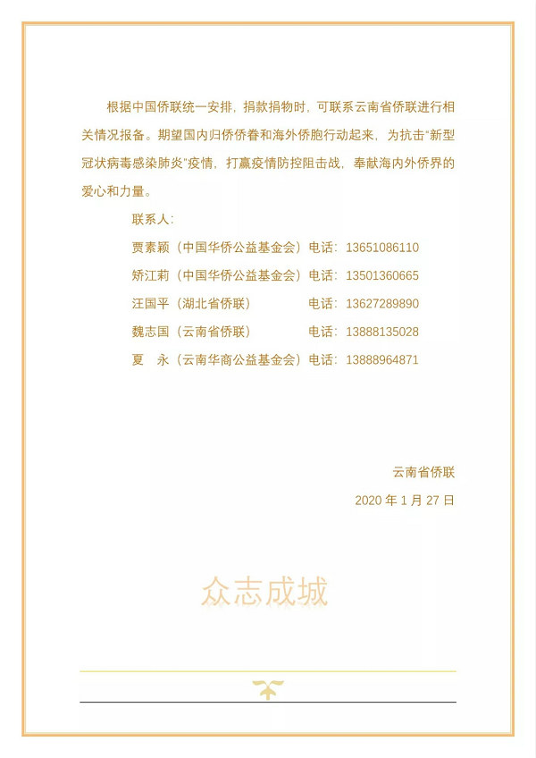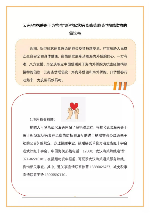 云南省侨联关于为抗击“新型冠状病毒感染肺炎”捐赠款物的倡议书