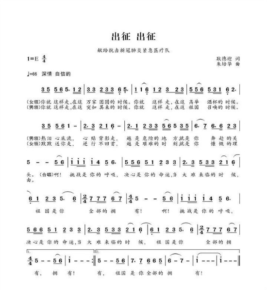 浙江旅欧知名作曲家、杭州市侨联兼职副主席朱培华与耿德迎合作,连夜创作了歌曲《出征 出征》,致敬赶赴一线的浙江医疗队。青年歌唱演员吴晓芳、吴昊睿声情并茂,精益求精。音乐伴奏带在北京制作,录音在杭州在兰州同时进棚,录音师杨建红专业混音,终于一气呵成。