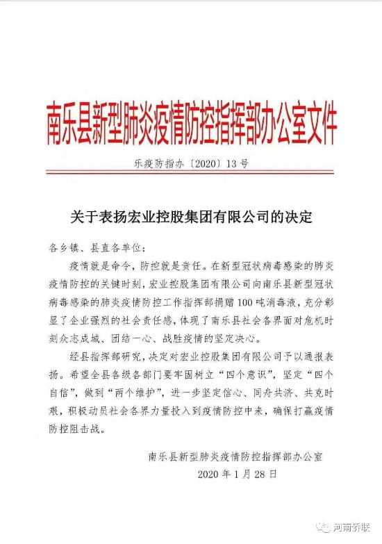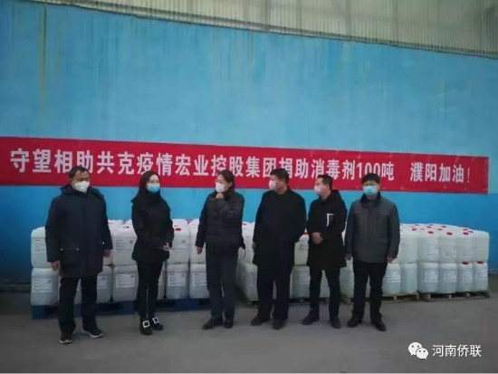 1月25日,河南省启动新型冠状病毒感染的肺炎疫情防控一级应急响应,要求各地全力以赴做好防控救治工作。作为当地的龙头企业之一,河南省濮阳市侨商会会员企业宏业控股集团有限公司立刻响应迅速沟通捐赠物资相关事宜,紧急从生产工厂协调100吨消毒剂通过南乐县向濮阳市政府捐赠,助力当地打赢疫情防控阻击战。