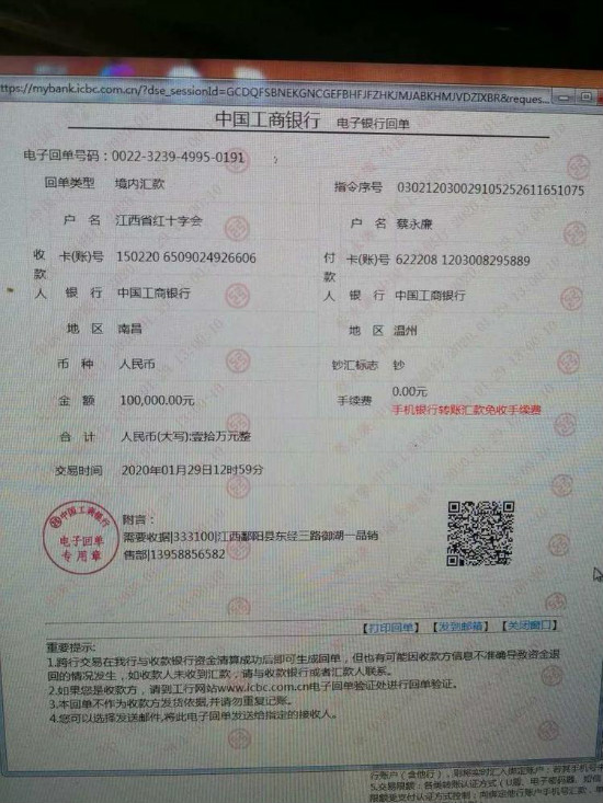 商会常务副会长、江西中宏瑞置业有限公司董事长蔡永廉第一时间捐款10万元,用于抗击疫情。