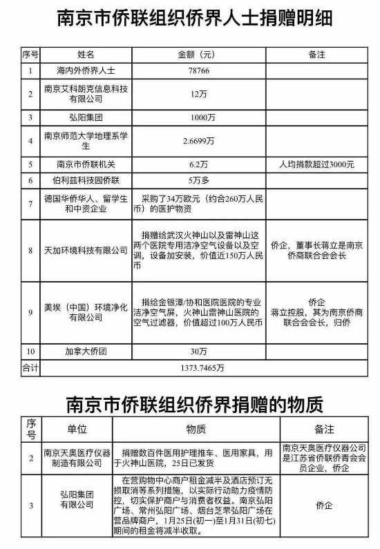 资金缺口同样考验着武汉的医疗应急能力。面对物资紧缺,更多的侨胞选择以捐款的方式帮助医院进行集体采购,帮助患者进行集中救治。面对疫情,无锡、南通等市侨联通过侨联委员广泛联系海内外侨胞发起捐款活动。1月28日,海门侨商、南通丰迪家纺有限公司负责人郁建元、郁礼平父子赶到海门工业园区,向园区捐赠伍万元,用于疫情前线抗击及防治工作,款项用于药品、医疗用品等急需物资的采购。随后,郁家父子又赶赴“华侨村”林西村,向村里捐赠了4000只口罩。侨资企业、南通康华照护服务有限公司董事长刘克明积极响应号召,发动企业职工捐款,共捐款50800元,通过江苏省华侨公益基金会康华照护基金定向捐给处置疫情的定点医院。斯里兰卡华人华侨联合会会长张旭东立即向全体理事会成员发起捐款,短短时间内就筹集17.4万人民币,并于1月29日汇给了湖北省侨联用于购买医护用品。金坛籍华侨、肯尼亚江苏商会副会长陈顺祥捐款5万元;钟楼区侨联副主席、常州格力博有限公司董事长陈寅捐款5万元,常州侨界已累计捐款捐物40余万元。于是,一条条捐款信息源源不断地传来,南通侨商郁家父子对“华侨村”捐款捐物的牵挂、无锡市全日本中国博士协会的号召……以个人名义、以公司名义、以基金名义……从几百元到几万元,大家的爱积少成多,汇聚成防疫的坚实力量。