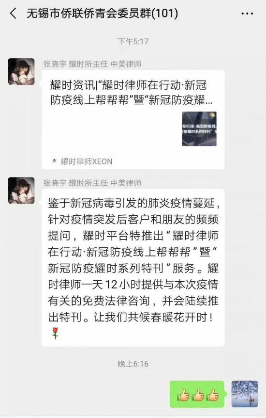 为保证武汉版“小汤山”医院建设按期完成,缓解床位紧张状态,无锡市侨青会副会长邵焜焜的企业国合绿材火速支援武汉火神山医院建设。产品装配与建设人员第一时间赶往武汉,提供物质保障与技术支持,为建设提速。无锡市侨青会委员、江苏耀时律师事务所主任张晓宇在耀时平台特推出“耀时律师在行动·新冠防疫线上帮帮帮”暨“新冠防疫耀时系列特刊”,每天12小时在线提供与本次疫情有关的免费法律咨询,为群众权益和集体利益保驾护航。
