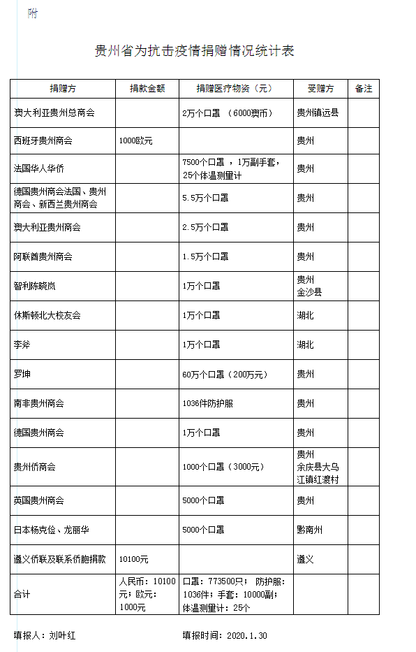 经统计,截止1月30日下午6时,已有澳大利亚、新西兰、英国、德国、法国、西班牙、阿联酋、南非等国贵州商会,美国休斯顿北大校友会,智利贵州商会副会长陈晓岚、美国波特兰大学终身教授李斧,日本华侨杨克俭、龙丽华以及法国华人华侨等海外贵州侨团和侨胞个人,省侨联副主席、省侨商会副会长、贵州德坤集团董事长罗坤、贵州侨商会和遵义侨联等省内侨界组织和个人进行捐款捐物,累计捐款人民币10100元,欧元1000元,捐赠口罩773500只,防护服1036件,手套10000副,体温测量计25个(捐赠统计表附后)。