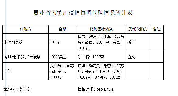为了让海外华侨华人的爱心快速落地,在省疫情防控工作领导小组的指导下,省侨联扎实做好服务工作,积极与省工信厅、省红十字会、贵阳市海关等部门沟通对接,为境外慈善捐赠物资开通绿色通道,并及时搜集有关需求和采购捐赠流程供华侨华人参考。对于大量医用物资,相关部门则委托华侨华人进行海外采购,再另行付款。目前遵义市侨联已协调非洲华文传媒集团、环球广域传媒集团有限公司董事长、中非民间交流与合作促进会会长、博茨瓦纳中国和平统一促进会暨华人慈善基金会主席、博茨瓦纳中国友好协会执行主席南庚戌先生帮助代购口罩50万只、手套100万只、鞋套100万只、头套100万只;南非贵州商会会长袁瑛帮助代购防护服1000套(代购统计表附后)。