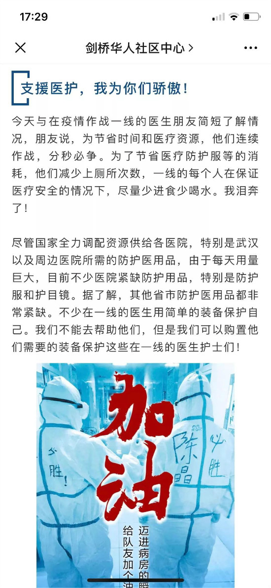 3、英国剑桥华人社区发起了“支援医护Stand By Our Doctors”慈善捐助活动。通过统一了解国内需求、统一购买符合捐赠要求的物品、统一运输和准备清关文件,将社区华人华侨捐赠的防护服、护目镜、口罩等医用防护物品集中运往国内,现已募集捐款11万元。