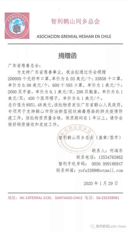 而连日来为了这批物资,积极联系货源、安排采购和货运的智利鹤山同乡总会各领导都表示,面对国内严峻的疫情,以及医院防护用品日益缺乏的情况,我们希望在智华人侨胞万众一心,争分夺秒行动起来,一起为疫情贡献力量,一起发扬一方有难,八方支援的中国传统美德。