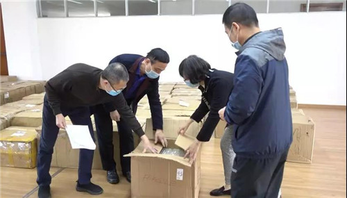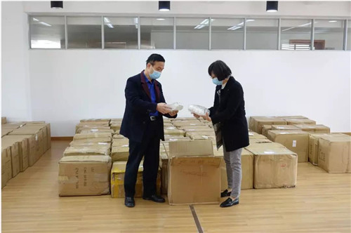 2020年2月1日,广东省侨心慈善基金会相关负责人(右一)向广东省慈善总会相关负责人(左一)捐赠从海外募集的防护物资。