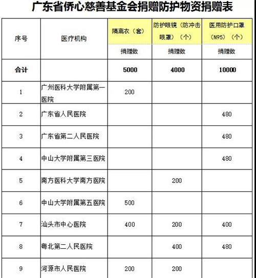 2020年2月1日,广东省侨心慈善基金会向广东省慈善总会捐赠了从海外募集的防护物资——1万个N95口罩、5千件医用隔离服、4千个防护眼镜。在广东省新型冠状病毒感染肺炎疫情防控工作领导小组办公室物资保障组(以下简称物资保障组)统一协调下,快速发放至省内25家医院(单位),用于支持广东新型冠状病毒感染肺炎的疫情防疫工作需要。据了解,这是疫情期间广东接收的首批国外非定向捐赠物资。