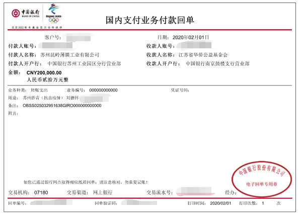 2月1日,苏州昆岭薄膜工业有限公司向江苏省华侨公益基金会捐赠20万元,支援抗击新冠肺炎疫情,展现了侨资企业的社会责任与担当。昆岭薄膜是印尼华人企业印多保利工业集团2001年在苏州投资建立的专业环保型企业,集团中国制造中心执行副董事长刘德怀先生表示:支援抗疫,每个人都有责任,我们只是尽了绵薄之力,相信众志成城一定可以取得胜利!