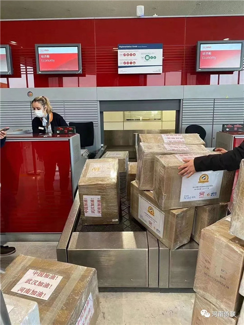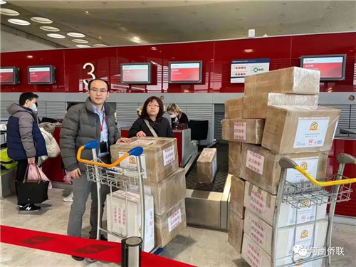 2月1日,法国河南商贸促进会的第一批募捐物资15500副医用外科口罩、8400只医用手套,几经周转,在侨联组织、机场、海关、驻外机构等多方努力协调下终于成行,即将到达国内,助力缓解国内抗击疫情医疗物资紧缺问题。