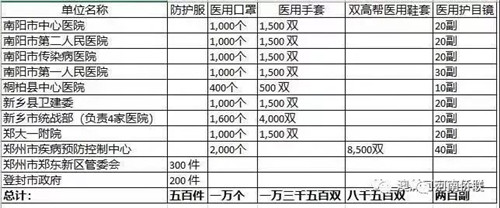 分别直接捐赠给南阳市中心医院,南阳市第一人民医院,南阳市第二人民医院,南阳市传染病医院,桐柏县中心医院,新乡市卫健委,新乡市统战部(负责4家医院),郑大一附院,郑州市疾病预防控制中心,郑州市郑东新区管委会,登封市政府等。