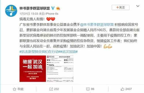北京时间1月31日,林书豪李群篮球联盟宣布:向湖北省青少年发展基金会捐赠人民币100万,同时也将发动全员募集并采购疫情防控应急物资!