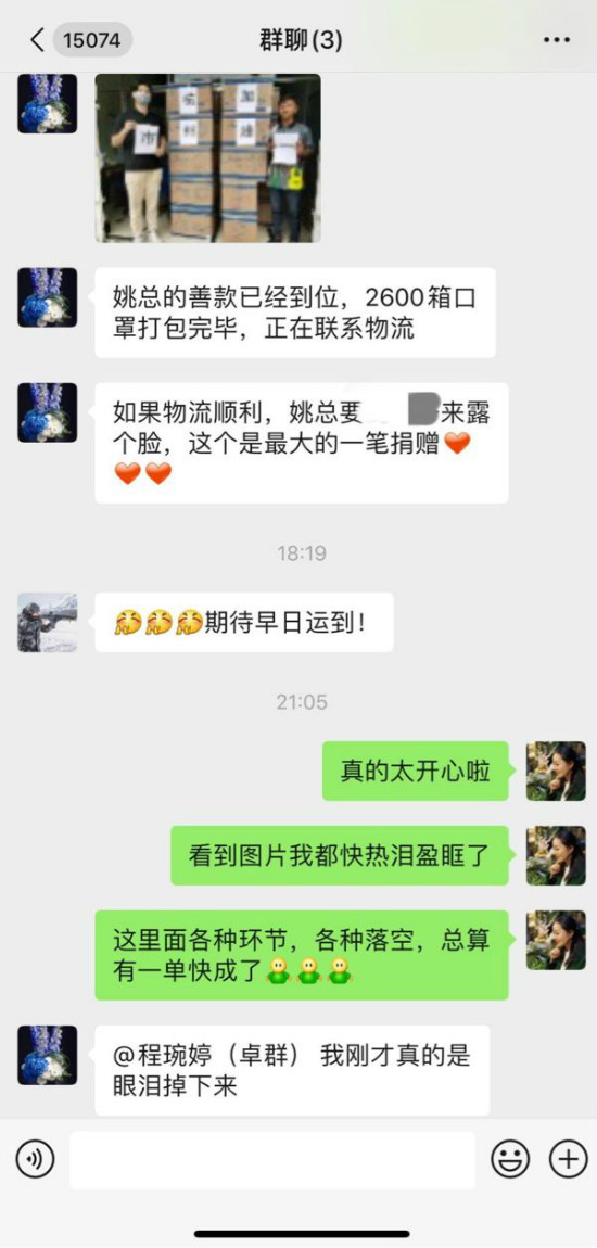 在十几个微信群中,她逐条筛选海外买手的云信息,尽己所能,力争10分钟内迅速回复,确保医疗防护用品的鉴别的同时,最快时间确保物资快速被锁定。
