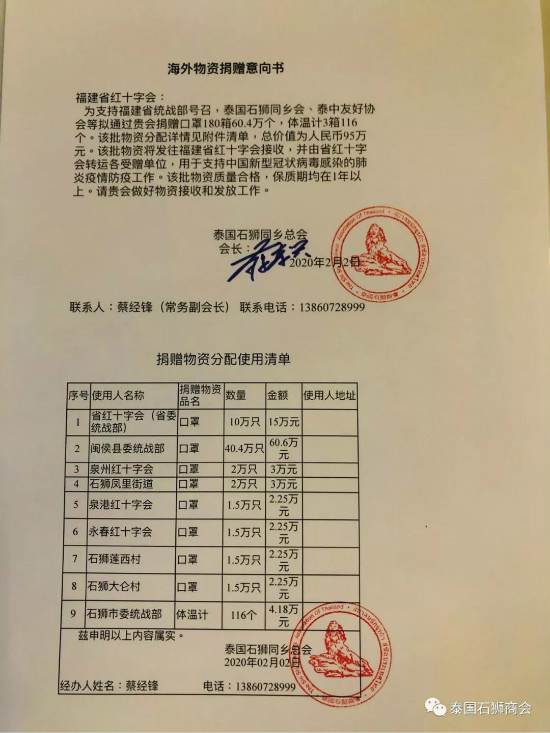 祖国新型冠状病毒感染的肺炎疫情自出现以来,得到了泰国石狮两会会员及旅泰侨胞的热切关注,在蔡孝兴会长的号召下,泰国石狮两会共筹得资金773000泰铢用于购买救援医疗物品。
