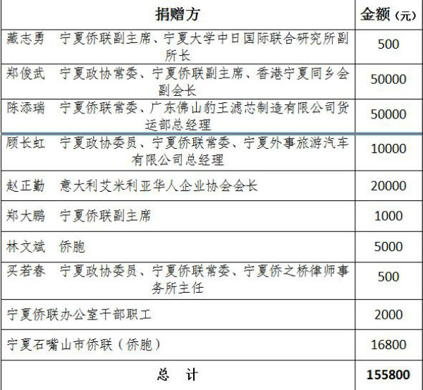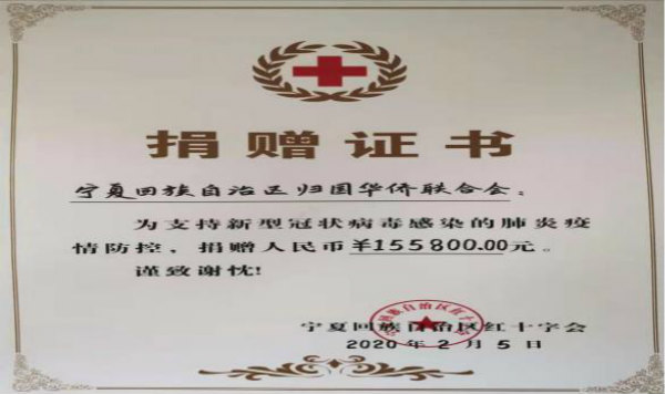 截止2月5日,宁夏侨联首批募捐款项共计155800元,已向宁夏红十字会完成了移交工作。
