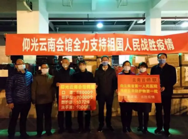 中国农历春节前,一场突如其来的新型冠状病毒疫情肆虐中华大地。中国的疫情发展,牵动着缅甸华侨的心,缅甸仰光云南会馆(青年组)得知云南防疫物资紧缺后,积极动员缅甸各界爱心人士帮助采购,共募集到一次性医用口罩68000个、医用防护帽70000个、医用防护服1072件,洗手液1000桶,此批物资于2月3日晚运抵昆明长水国际机场。当晚,货物通关后,立即通过云南华商公益基金会捐赠给云南省第一人民医院、昆明医科大学第一附属医院、云南省传染病医院、昆明市儿童医院、昆明市公安局特警支队等单位,火速送往奋战在防疫一线的医务人员、公安干警。