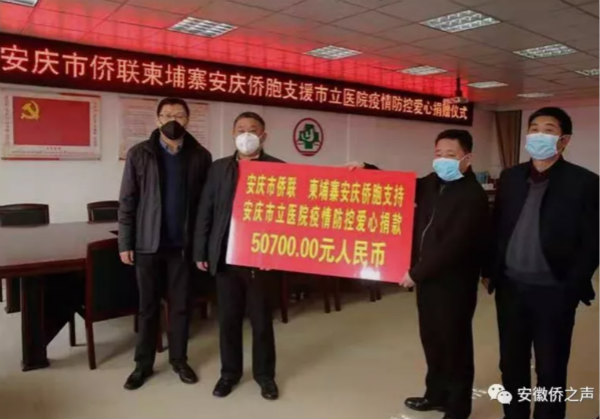新型冠状病毒感染的肺炎疫情牵动着海外安庆侨胞的心。安庆市侨联于1月29日向海内外安庆籍侨胞发出为打赢“新型冠状病毒感染的肺炎”防控阻击战捐赠医疗用品的倡议书。连日来,世界各地的安庆侨胞和侨团快速行动起来,纷纷来电来微信了解捐赠渠道,并积极发起募捐,一份份爱心从海外传来,彰显出安庆侨界“爱国爱乡”的大爱无私情怀,截至2月5日,共收到捐款50700元,及时转赠到安庆市立医院。