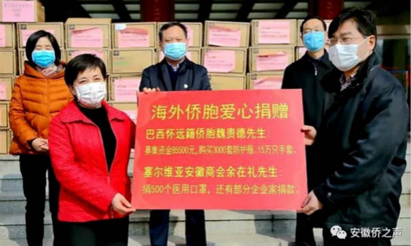蚌埠怀远籍安徽同乡总会魏贵德主席,远在巴西,积极牵头组织筹款购置防护装备,共购置3000套防护服和15万双手套,物资运达蚌埠后,已由市政府统一调配到急需的医院。加拿大安徽同乡总会赵完全会长,首批购买4CR FFP2口罩1200只,Kirland 医用橡胶手套7200双,总计折合3484加元,定向捐赠蚌医附院等三家医院。塞尓维亚安徽同乡总会余在礼会长捐赠500只医用口罩已运抵蚌埠。意大利威尼斯华侨李辉先生捐款10000元人民币。蚌埠市侨联常委、云云女士和女儿张云依捐款6000元人民币。