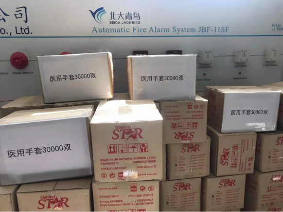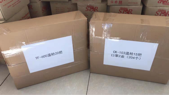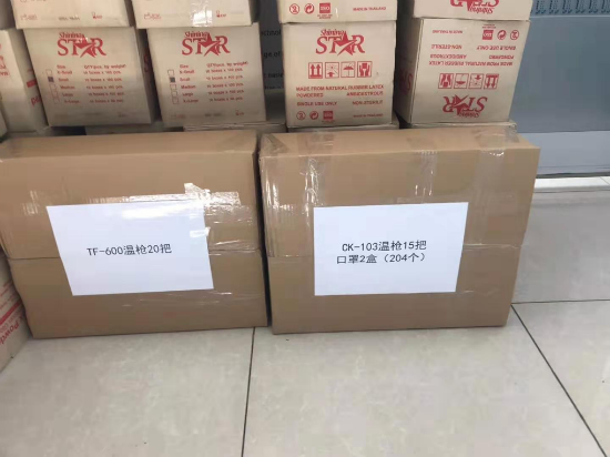 第二批爱心物质 ,医用手套30000双、医用口罩10204个、测温枪35把已准备完毕。