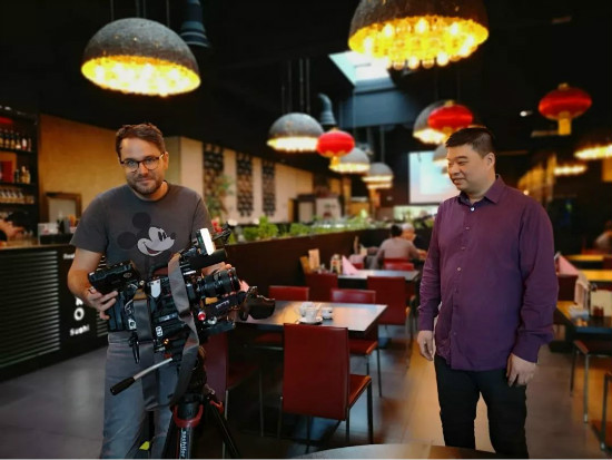 朱茂奏在自己经营的餐厅接受奥地利Servus TV电视台采访
