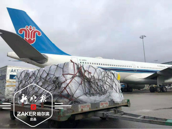 图为美国勋菲尔德国际音乐协会捐赠给哈尔滨的 10 万个医用口罩准备装机运往北京首都机场