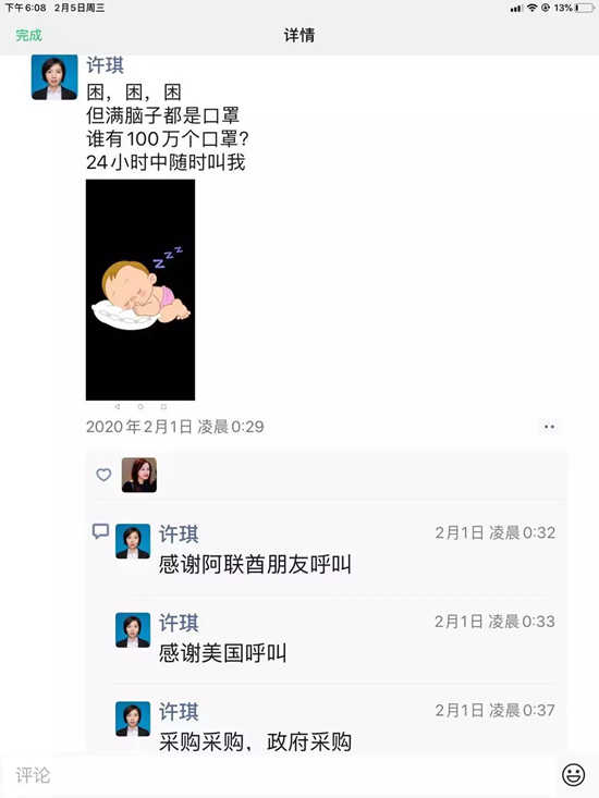 南充侨联主席许琪2月1日凌晨发了一条微信:困,困,困!但满脑子都是口罩。谁有100万个口罩?24小时中随时叫我……感谢阿联酋朋友呼叫……感谢美国朋友呼叫……有信息支援我,我们人口太多了……