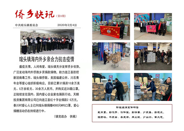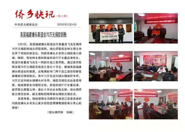 2月3日,琯头镇侨联迎来了一位“特殊”的来宾——美国福建塘头联谊会的代表董茂飞先生,他携带着旅美塘头乡亲热心捐赠的70万元人民币善款,赶到琯头镇侨联。在连江县委县政府举办的捐款交接仪式上,县委常委、县委统战部部长冯慧钦向旅美塘头乡亲对家乡防控疫情慷慨捐款表示衷心的感谢。根据塘头联谊会的意愿,此笔捐款将专门用于连江县防控新型冠状病毒肺炎物资的购买。在镇侨联动员下,琯头籍侨资企业家踊跃行动,天麟投资集团有限公司向连江县红十字会捐款20万元;琯头镇秦川村侨界爱心人士向琯头镇捐赠4000只N95口罩。