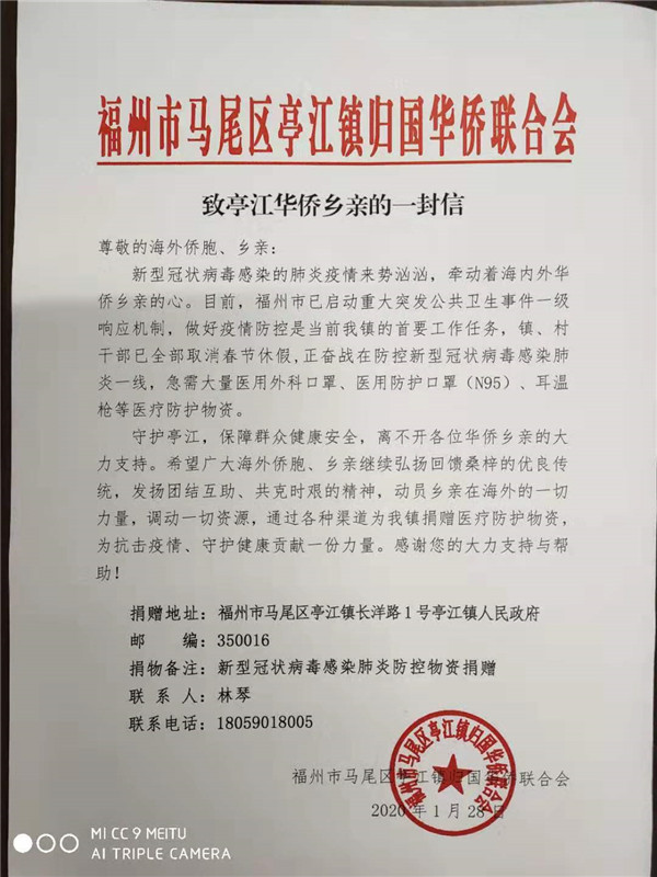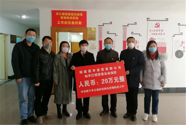 在亭江镇侨联的号召下,1月31日,福建磊丰家居集团公司董事长、马尾区人大代表陈子钦,捐赠20万元专项用于购买口罩等医疗防护物资,他说,“当前疫情防控形势严峻,虽是春节假期,但亭江所有镇村干部奋战在抗疫一线,而我们只能呆在家里,捐点钱物用于防控疫情,也算是为社会做点贡献”。