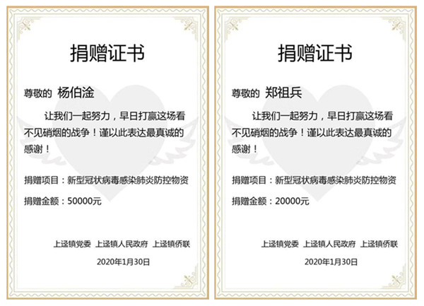 福清市宏路街道侨联、上迳镇侨联,紧紧围绕当地党委政府防控疫情的部署,派出侨联干部、组织侨界群众参加抗击疫情的工作,在村口站岗,为过往的群众测体温,上迳镇侨联主席杨宗铭电话查询侨胞有否去武汉或与患者接触的情况。向本籍海外乡亲及社团发起捐款捐物行动,得到积极响应。上迳籍侨领杨伯淦先生收到镇侨联的倡议后,捐赠50000元人民币,郑祖兵先生捐赠20000元人民币,用于购买疫情防控物资,与祖国和家乡人民守望相助,共克时艰。